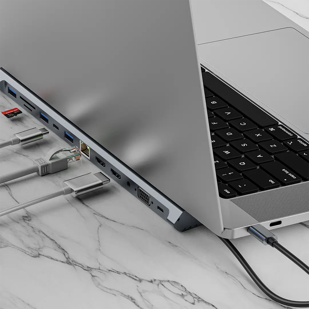 The 12-in-1 Green Lion 4K HDMI Ethernet USB-C Hub is a hybrid of variety and performance for the range of connectivity and functionality. Constructed with an aluminum alloy body, the hub hosts Type-C upstream ports with 5Gbps transfer rates and USB-A 2.0 port transfer rates up to 480Mbps. It is equipped with 5Gbps USB-A 3.0 ports, a 5Gbps Type-C female port, and finally a 100Mbps RJ45 Ethernet port for those whose device needs a myriad of connectivity. It supports 4K HDMI output at 30Hz and features a dual HDMI port and a VGA port for 1080P display. Additionally, it provides a 100W PD Type-C port for fast charging along with SD/TF card slots and a 3.5mm audio jack. The lengthy 29cm cable offers additional setup convenience and is securely placed on non-slip pads. Whether at a workstation, home, or elsewhere, the Green Lion is a complete solution to connect-it-all kind of hub. Specification