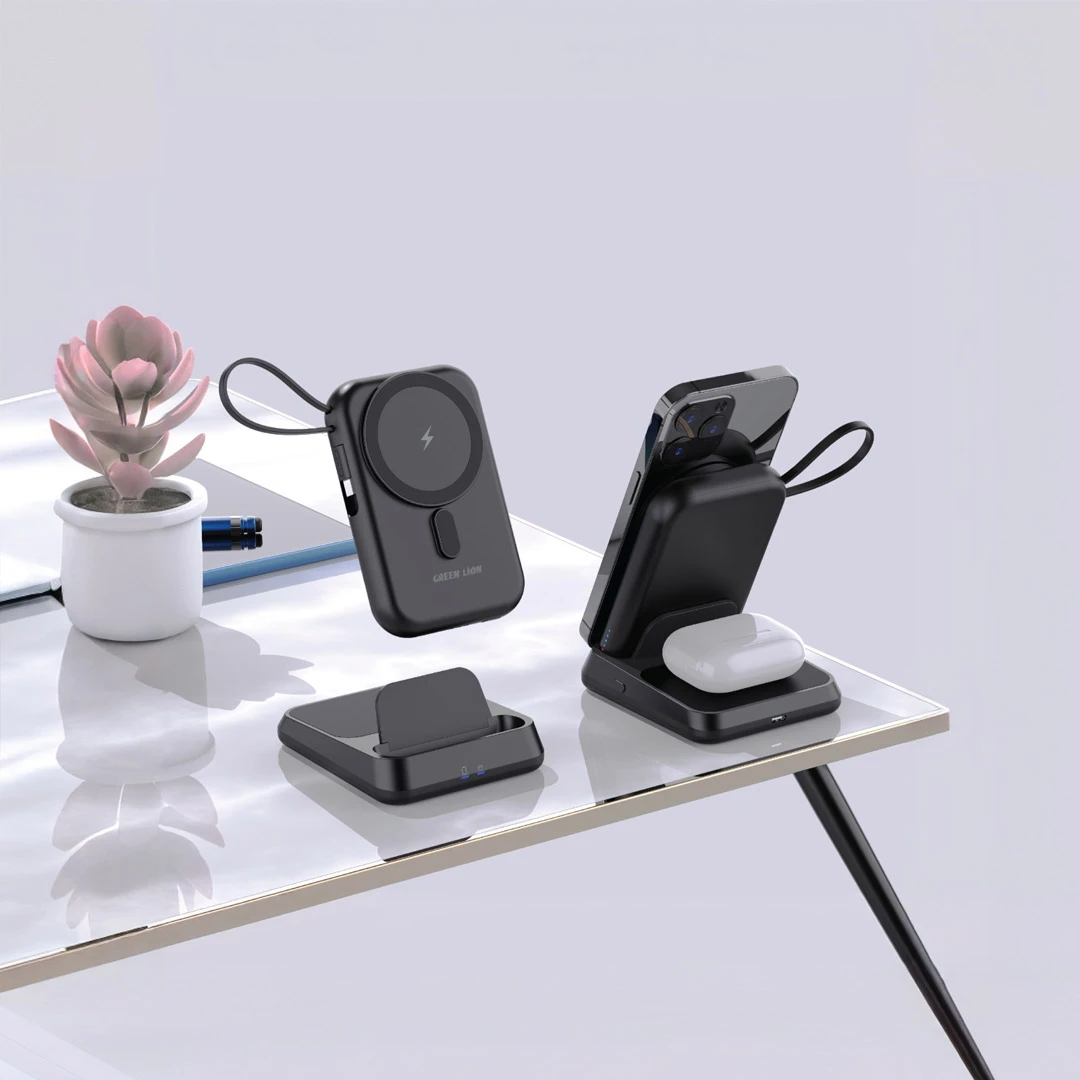 The Green Lion 3 1 Magsafe 10000mAh Power Bank is all you need to keep your devices charged up. This power bank can simultaneously charge your phone and another MagSafe compatible device, such as your earbuds. It has 10,000 mAh of battery capacity, and because of the materials used, the battery is more durable than other types of power banks. Overall, the Green Lion 3 1 Magsafe 10000mAh Power Bank is perfect for your work desk and your home because it can save you a lot of time by having the ability to rapidly charge your devices.