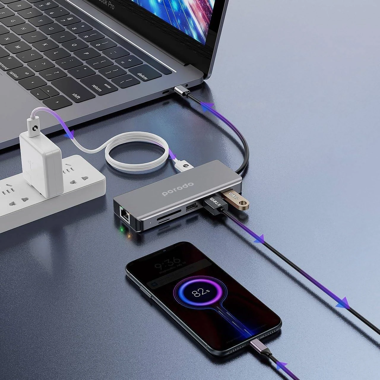 If you're in need of a versatile hub that simplifies the connection of multiple devices to your laptop or tablet, look no further than the Porodo multi-functional hub. This hub offers a wide range of ports, ensuring that you'll find the specific ports you require. To start with, it features a Type-C input for connecting with your laptop or tablet. Moreover, the Type-C PD Charging port provides an impressive power output of up to 100W, efficiently charging your devices. Additionally, there's a 3.5mm Audio Jack that allows you to effortlessly connect headphones or speakers. For those seeking a high-definition visual experience, the hub includes a 4K Ultra HD Port, enabling you to enjoy stunning visuals. Furthermore, the 100M RJ45 Ethernet port facilitates a stable and reliable wired network connection. To meet your data storage needs, the hub features both a microSD slot and an SDXC slot, supporting both micro-SD cards and SDXC cards for easy data transfer. Moreover, two USB 2.0 ports are available for connecting USB 2.0 devices like flash drives, mice, and keyboards. Lastly, there's a USB 3.2 port with a blazing-fast 10Gbhz super speed, perfect for connecting USB 3.2 devices such as external hard drives and SSDs. Finally, the hub is also compatible with Android, iOS, Mac, and Windows devices. What are you waiting for?