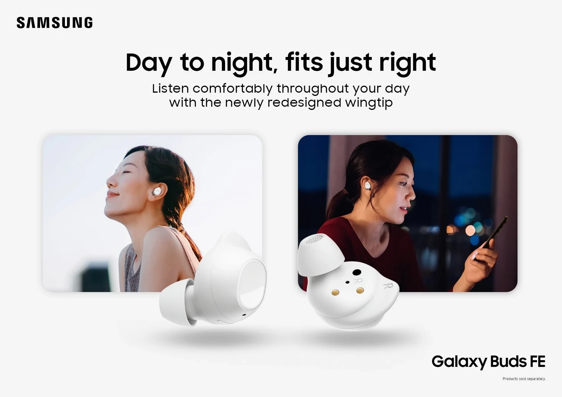 Meet Galaxy Buds FE, your new favorite everyday audio experience. Buds FE fit comfortably into your day, combining your favorite Galaxy innovations on the go. With their ear-friendly design and a variety of wingtip options, your Buds stay in place securely and comfortably — you might even forget you’re wearing them. Lose yourself in the sounds you love with Active Noise Cancellation and Ambient Sound. Plus, Buds FE connect seamlessly with your Galaxy devices — get ready for effortless pairing from your phone to your Tab to your laptop. It’s easy to keep up with Buds FE too. Get a notification if you leave a Bud behind, and locate it easily with SmartThings Find.* Enjoy your favorite audio experiences throughout your day with Galaxy Buds FE. Now you can hear translations through your Buds while on calls or during face-to-face conversations.*