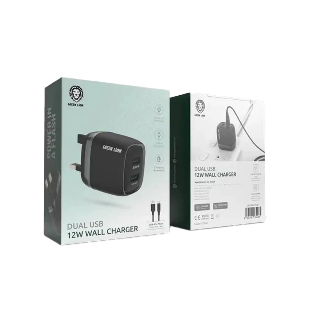 Presenting the Green Lion Dual USB 12W Wall Charger with USB-A to Micro Cable (1M) : efficient and convenient charging of all your devices. This is a wall charger with a dual USB design that can charge two devices simultaneously with powerful, fast charging at 2.4A to ensure that your devices get the power in record time. It comes with a flexible USB-A to Micro 1 Meter PVC cable that makes connections between your devices real quick and easy without necessarily getting tied to the wall. Since charging protection is built in, you can ensure your device is well-guarded against overcharging and short circuits. This product also supports dual-layer charging with optimizations in its software for performance and durability. With the addition of USB-C, however, it's ready for a wide array of devices. Get fast, safe, and efficient charging with the Green Lion Dual USB Wall Charger, ideal for home and on-the-go use.