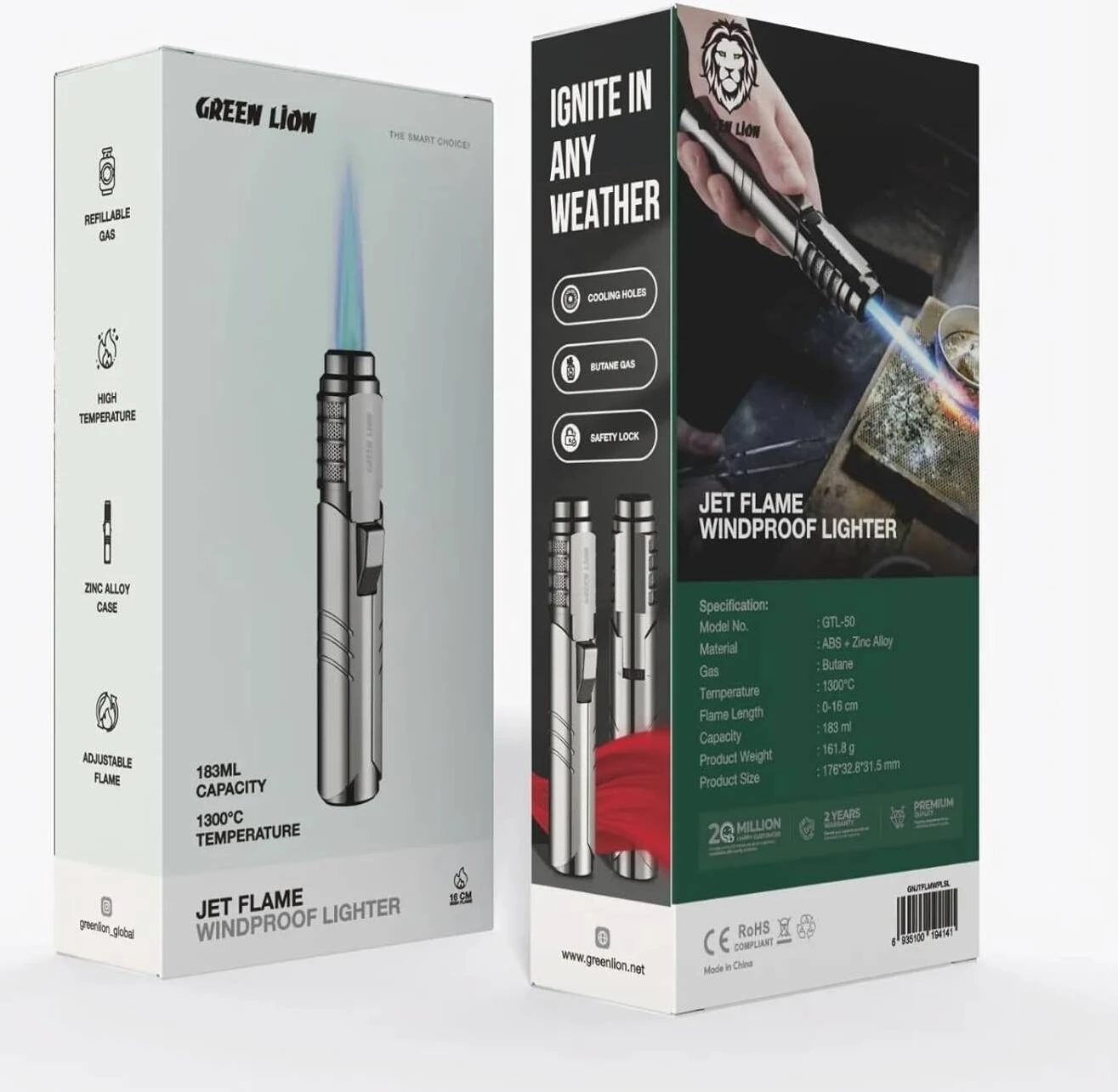 Green Lion Jet Flame Windproof Lighter - Silver