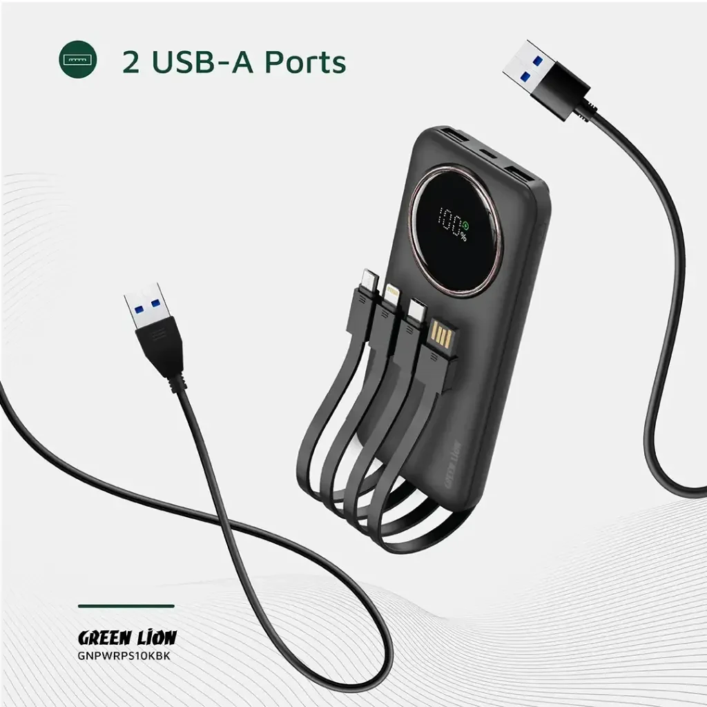 DescriptionThe Green Lion Power Pulse 10000mAh Power bank is an adaptable, reliable means through which to maintain a positive charging status on the go. Crafted from ABS and PC, it's strong enough to boast up to 10000mAh in real battery capacity- a powerhouse for any device. Equipped with a number of input and output options, this power bank supports fast charging via its Type-C port and cable-PD 22.5W and USB-A ports-QC 22.5W to give flexibility for various devices. Further, it has built-in Lightning and Micro cables to accommodate a wide range of charging needs. The digital display on the power bank keeps you informed about the remaining battery life, while the built-in cables add convenience, as one doesn't need to carry any extra accessories. With its 22.5W fast charging capability, it is supposed to efficiently deliver power and is perfect for smartphones, tablets, and other USB-powered devices. The Green Lion Power Pulse is the ultimate portable charging companion, compact in design and with advanced features. SpecificationFeatures0/5