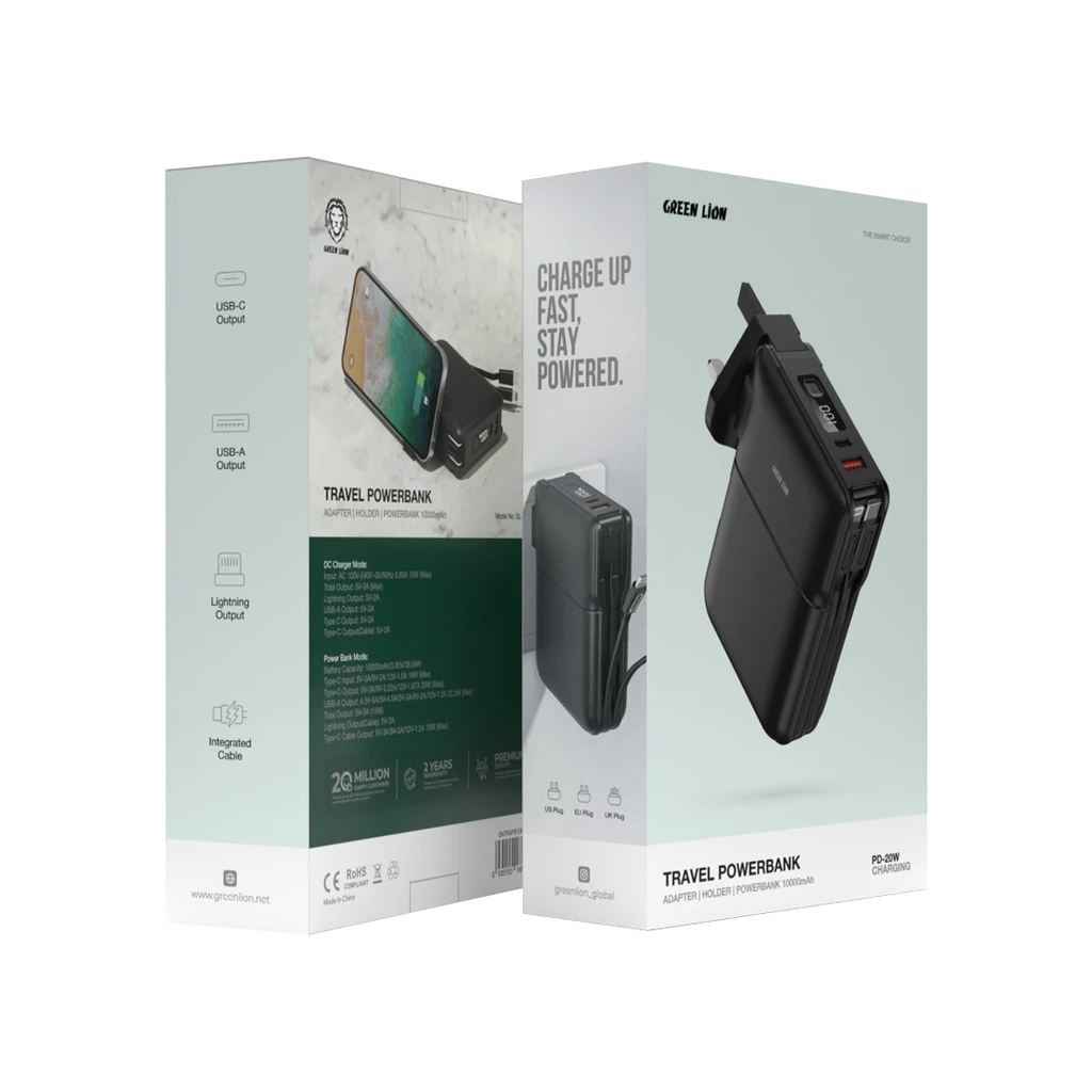 DescriptionWith the Green Lion Travel Power Bank, you won’t need to bring any other charger with you while traveling. When you need to charge your phone in the house, this power bank acts as an adapter and can charge your phone with up to 10W of power. When the electricity is not available, this device acts as a power bank with a 10000mAh capacity and can charge up your phone multiple times. And finally, when needing a holder, this power bank becomes a holder. The Green Lion Travel Power Bank is perfect for anyone who plans to go on a vacation. SpecificationDC Charger Mode Power Bank Mode 0/5