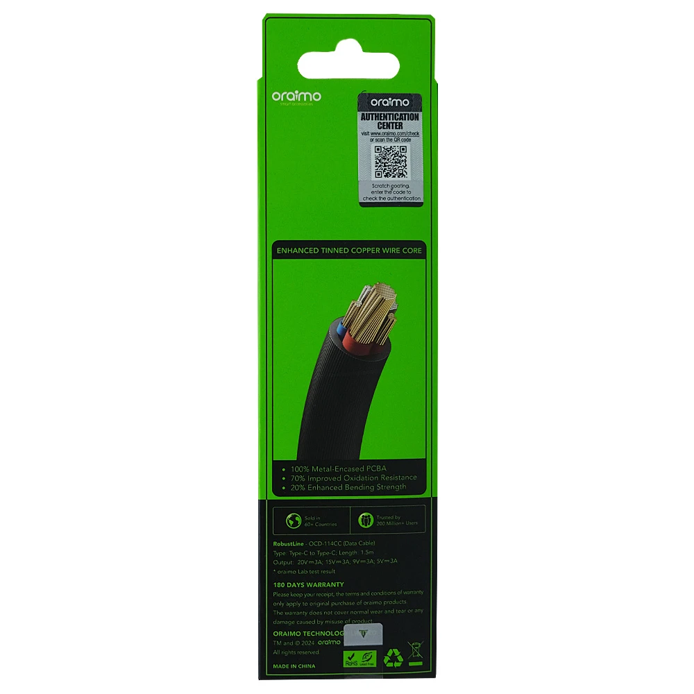 Experience lightning-fast data transfer and charging with the Oraimo 60W Ultra Fast Robust Line Data Cable Type C to C. This durable cable is designed for seamless connectivity and high-speed performance.