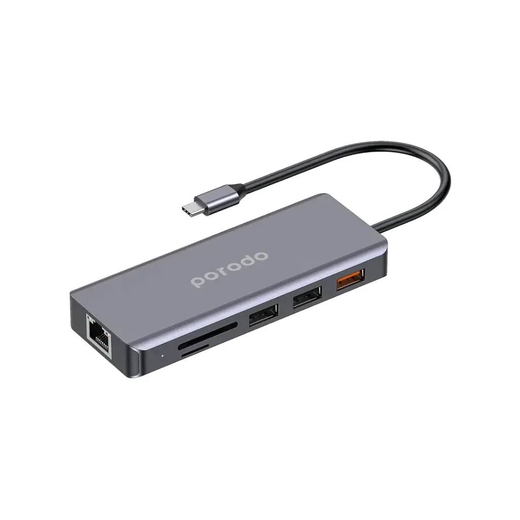 If you're in need of a versatile hub that simplifies the connection of multiple devices to your laptop or tablet, look no further than the Porodo multi-functional hub. This hub offers a wide range of ports, ensuring that you'll find the specific ports you require. To start with, it features a Type-C input for connecting with your laptop or tablet. Moreover, the Type-C PD Charging port provides an impressive power output of up to 100W, efficiently charging your devices. Additionally, there's a 3.5mm Audio Jack that allows you to effortlessly connect headphones or speakers. For those seeking a high-definition visual experience, the hub includes a 4K Ultra HD Port, enabling you to enjoy stunning visuals. Furthermore, the 100M RJ45 Ethernet port facilitates a stable and reliable wired network connection. To meet your data storage needs, the hub features both a microSD slot and an SDXC slot, supporting both micro-SD cards and SDXC cards for easy data transfer. Moreover, two USB 2.0 ports are available for connecting USB 2.0 devices like flash drives, mice, and keyboards. Lastly, there's a USB 3.2 port with a blazing-fast 10Gbhz super speed, perfect for connecting USB 3.2 devices such as external hard drives and SSDs. Finally, the hub is also compatible with Android, iOS, Mac, and Windows devices. What are you waiting for?