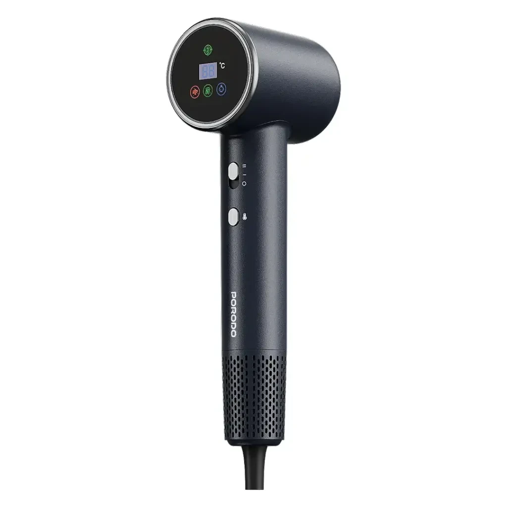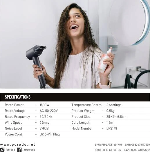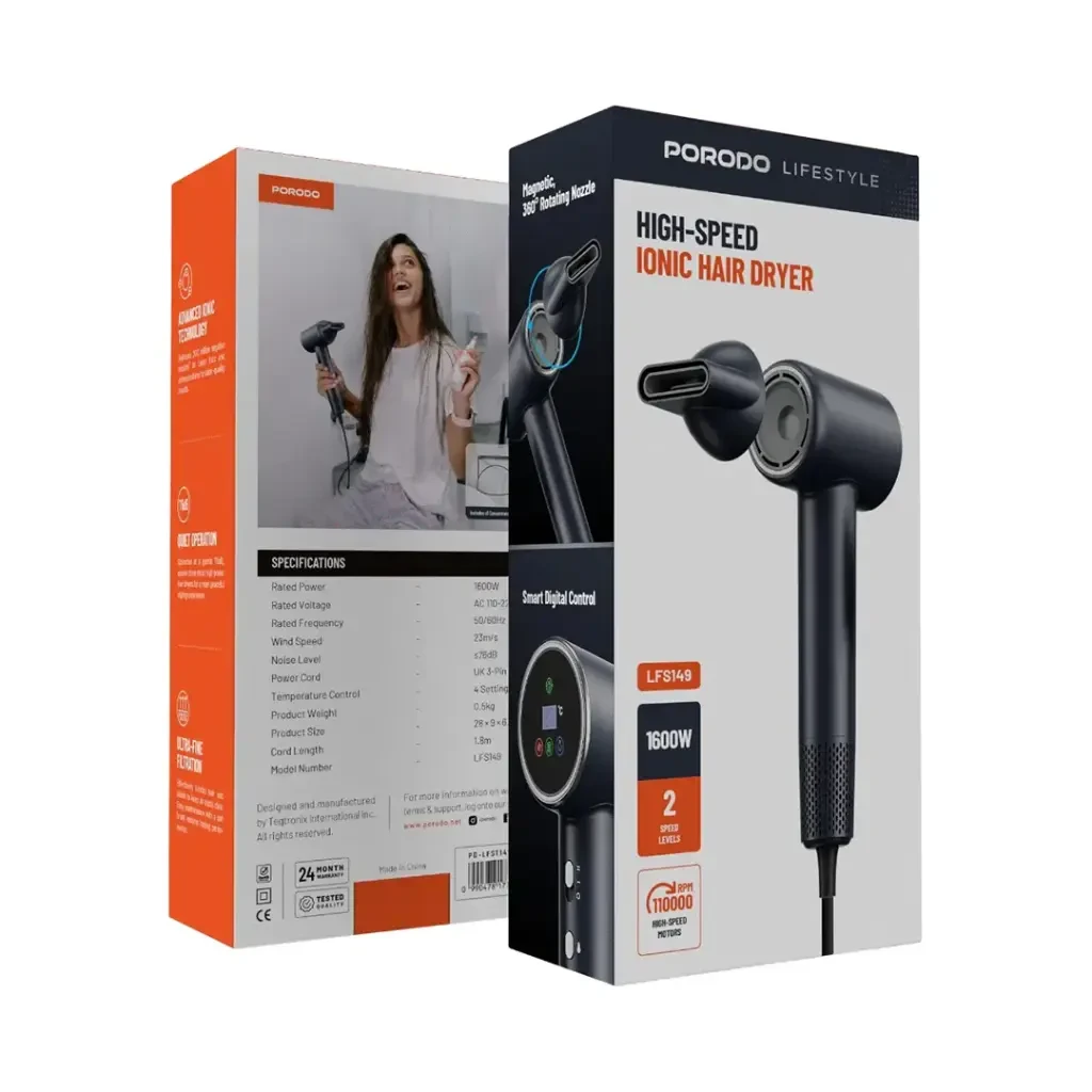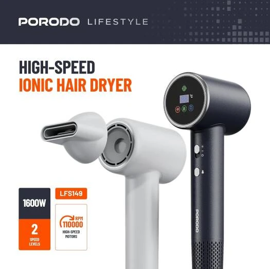 Porodo Lifestyle High-Speed Ionic Hair Dryer delivers silky, frizz-free hair with fast, efficient drying with 1600W power and cutting-edge ionic technology. With 23m/s wind speed and 110,000 RPM high-speed motors, the dryer dries hair but keeps it healthy. The dryer is quiet, with a ≤76dB decibel level, offering a peaceful drying experience. It has four heat settings for managing heat, allowing you to adjust the drying process to suit different hair textures and types. The ultra-fine filter only allows clean air to pass through the blow, reducing dust and debris damage. The 1.8m cord provides mobility, and the dryer comes with a UK 3-pin plug to suit UK sockets. Whether you blow-dry at home or on the move, the Porodo Lifestyle High-Speed Ionic Hair Dryer provides day-to-day performance, convenience, and reliability.