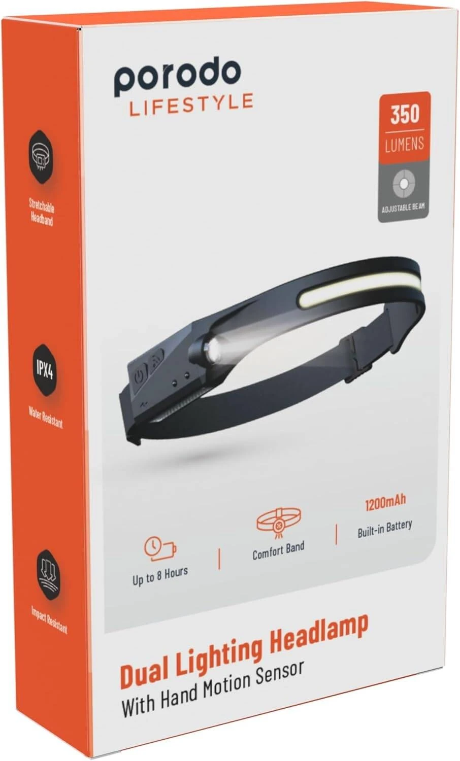 Porodo's Dual Lighting Headlamp brightens your outdoor activities with its powerful 350-lumen adjustable beam. With a 1200mAh battery, you can have light for up to 8 hours, so you're never left in the dark. The unique hand motion sensor allows for hands-free operation, and the comfort band provides a perfect fit. Five flexible light options let you choose the right setting for any situation. Porodo's headlamp is the perfect companion for camping, hiking, or just having reliable illumination when you're out and about. Light your way with ease and without using your hands.
