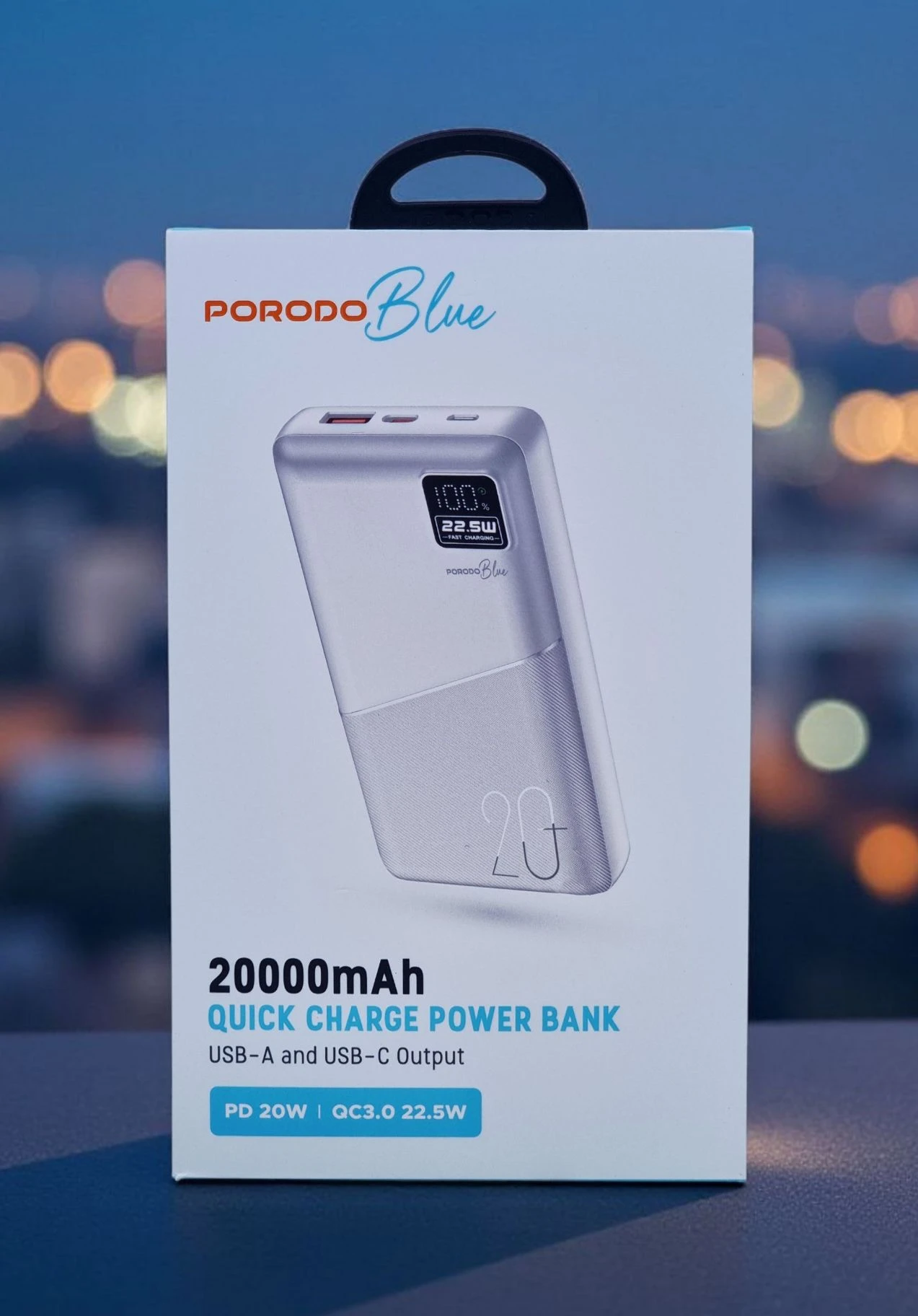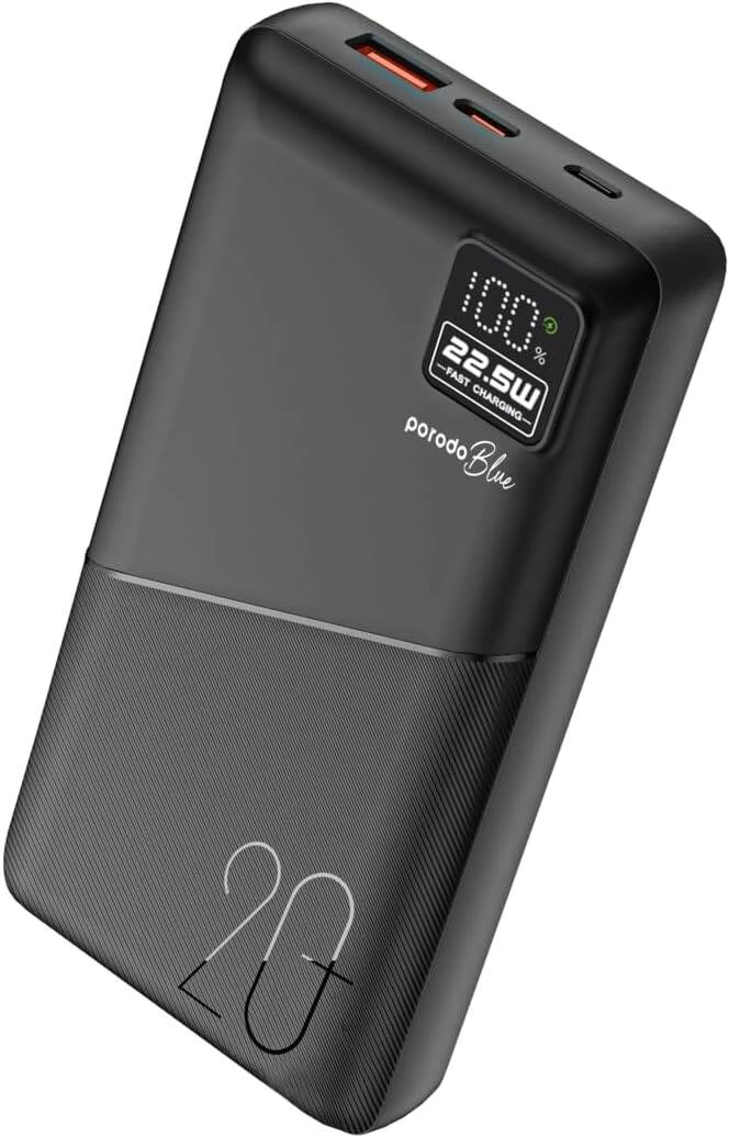The Porodo Blue Quick Charge Power Bank with USB-A & USB-C Outputs is built to charge quickly and efficiently wherever you are. This power bank has a 20000mAh battery Capacity, which combines 20W PD (Power Delivery) and 22.5W QC3.0 (Quick Charge) to charge your devices very quickly. With a range of 0% to 65% in just 35 minutes, you'll always be connected without major wait times. This power bank is adaptable to a variety of devices. Its Micro and Type-C inputs both provide 18W of flexible recharging. The dual USB output allows you to charge two devices at once, making it great for busy people. A built-in digital display informs you of the power bank's remaining battery life, so you're always prepared. The Porodo Blue Quick Charge Power Bank is the perfect travel mate. It has a stylish design and high-speed charging for your important devices. BrandPorodo Blue ModelPB-PBFCH054-BK PortableYes Fast Charge SupportYes Digital DisplayYes StandardsCE Country of OriginChina ColorBlack Battery Capacity20000 mAh Micro Input5V/2A, 9V/2A, 12V/1.5A, 18 W 0/5