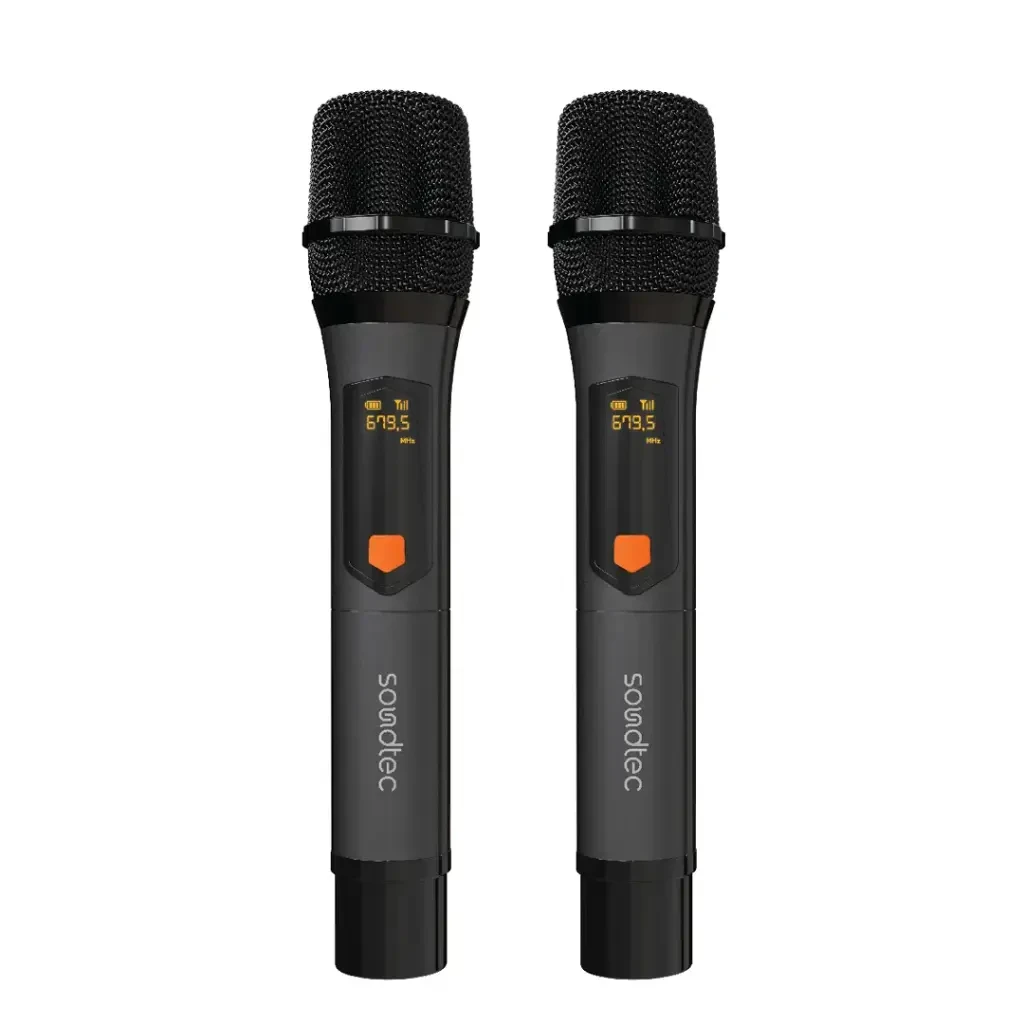 DescriptionPorodo Soundtec Duo Mic Aluminum Wireless Microphone Rechargeable - Black has been innovatively designed for the best vibrancy in sound coupled with seamless connectivity. It comes with two rechargeable 800mAh batteries, which can provide audio output of up to 4.5 hours on a single charge with a 25-meter radius for wireless and freedom movement. Engineered with DSP regulation technology and ultra-high frequency (2.3GHz/2.4GHz/2.5GHz) signal transmission, it guarantees audio transmission of really high quality. It also features plug & play in a 6.3mm mono plug, working well with karaoke machines and audio systems. Its digital display, Type-C charging, and unidirectional polar pattern make it an excellent choice for karaoke, performance, and professional applications. Specifications